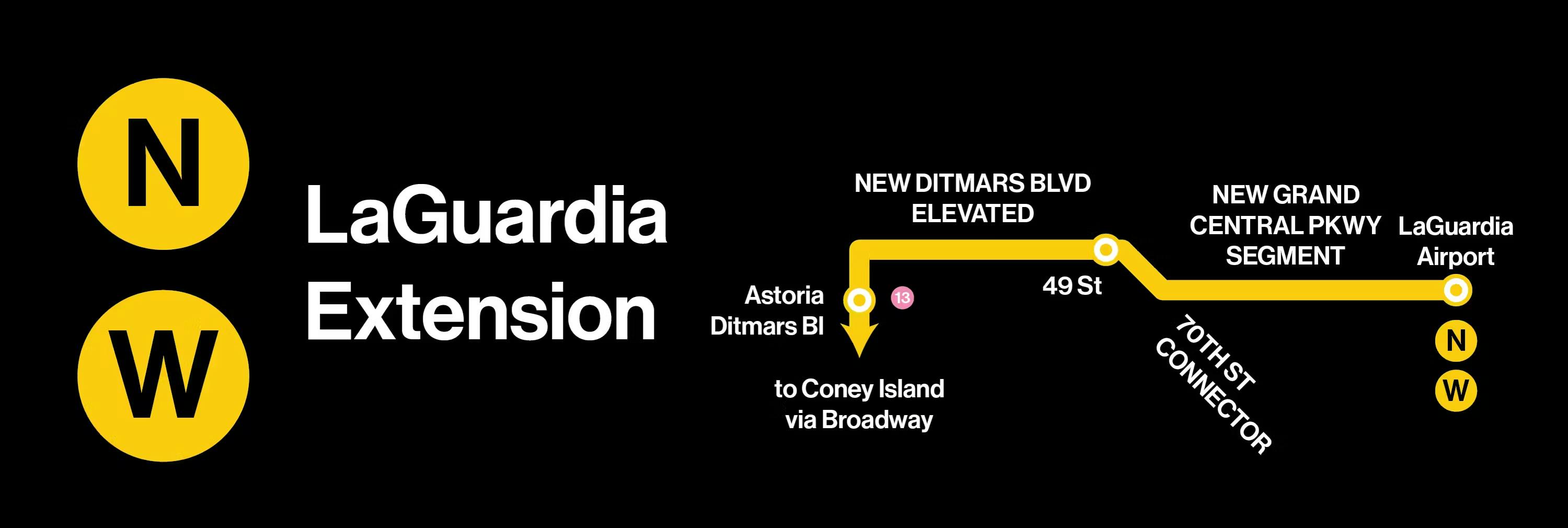 Build a direct N/W subway extension from Astoria–Ditmars Blvd to LaGuardia Airport, with two on-airport stops so riders can reach terminals quickly—without shuttles and without transfers.